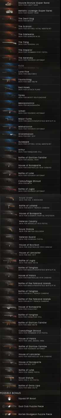 Hier können Sie einen Blick auf die vollständige Liste der verfügbaren Skins und Puzzleteile werfen.