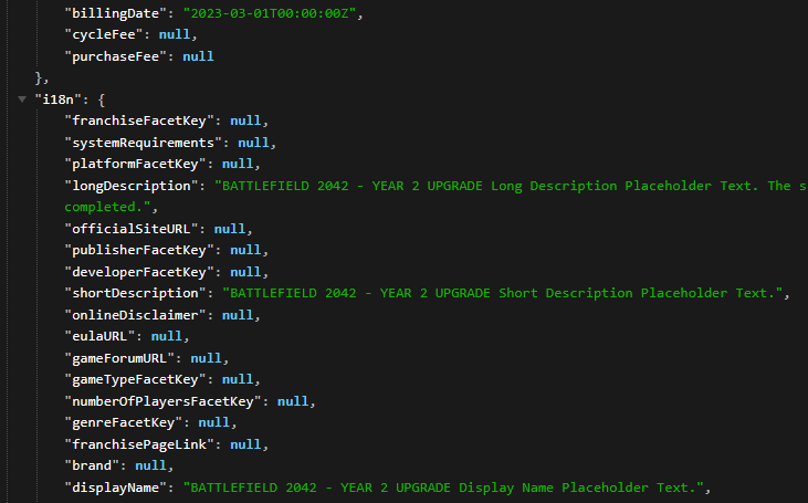 - Dies ist kein Fake, sondern nur ein „Angebot“ innerhalb der API mit Platzhaltertexten (es heißt „BATTLEFIELD 2042 – YEAR 2 UPGRADE – PC – WW“) – es wurden keine hochgeladenen Inhalte im Store gefunden.