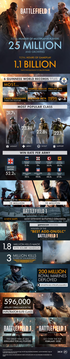 Aber das ist noch nicht alles. Das Entwicklerstudio DICE hat auch eine Infografik mit einigen interessanten Statistiken zu Battlefield 1 erstellt. Die Zahlen zeigen, welche Klassen am beliebtesten sind, welches Fahrzeug die meisten Abschüsse verzeichnet und vieles mehr.