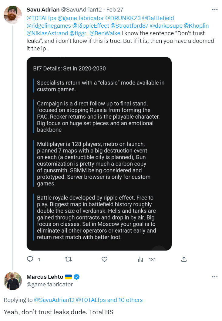 Trotz fehlender offizieller Ankündigung kursieren bereits viele Gerüchte und angebliche „Leaks“ zu Battlefield 7 im Internet. Doch zum Glück hat Marcus Lehto, Chef von Ridgeline Games und Game Director von Battlefield, diese schnell entkräftet. Auf Twitter bezeichnete er die angeblichen Spieldetails als „totalen Schwachsinn“ und warnte die Fans davor, diesen Leaks zu glauben.