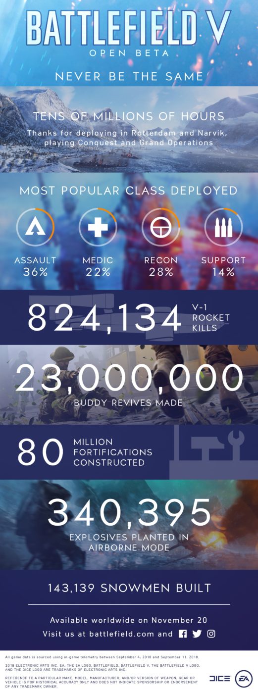 DICE hat mit der Veröffentlichung der Infografik einen Einblick in die Statistiken der Battlefield V Beta gegeben und gleichzeitig einige kommende Änderungen angekündigt. Es bleibt spannend, wie sich das Spiel bis zum Release noch weiterentwickeln wird. Hast du die Beta gespielt und freust dich auf die finalen Veränderungen? Lass es uns in den Kommentaren wissen!
